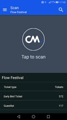 With the CM Tickets ScanApp, you can easily validate E-tickets for your event. Quick and easy. Just scan the code on the ticket with this free app. The ScanApp will tell you if the ticket is valid and gives you real-time insights in the number of visitors at your event.